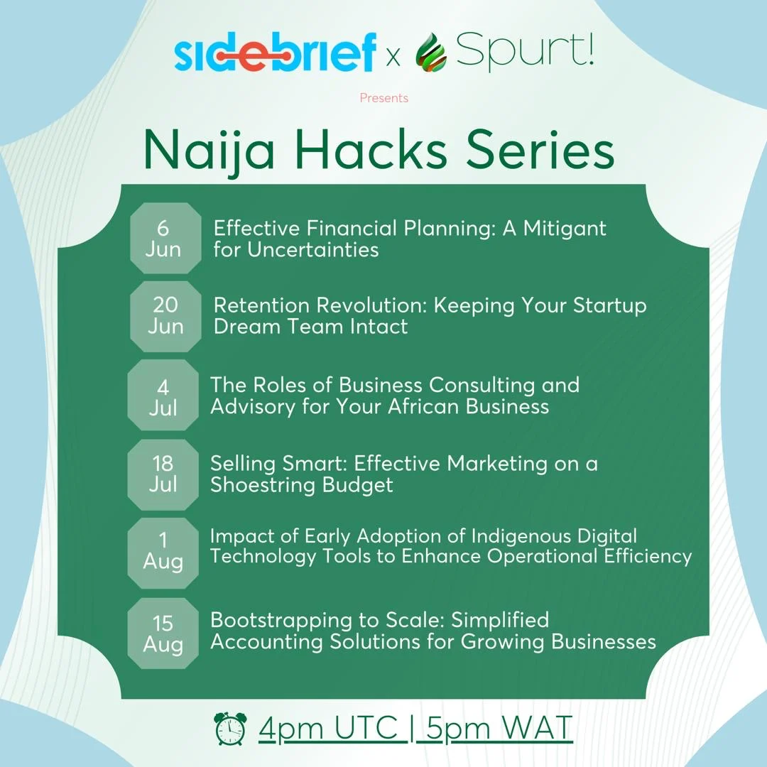 The Naija Hacks Series – a dynamic three-month webinar series presented by Spurt and Sidebrief – is your chance to discover these powerful local alternatives.